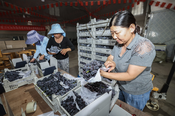6月25日,在慈溪市坎墩街道农创园的慈溪市绿琴果蔬农场内,工作人员将采收的葡萄分拣、装盒。