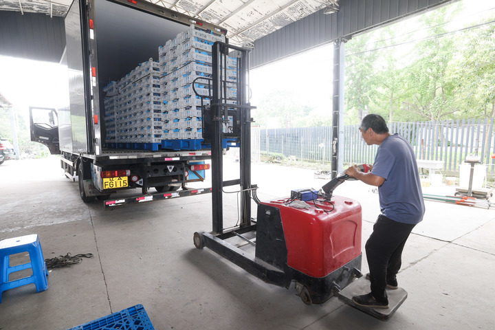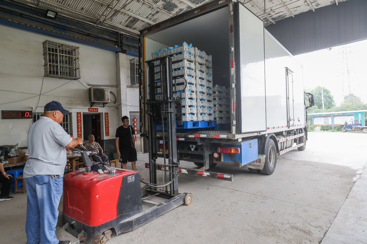6月25日,慈溪市坎墩街道农创园的慈溪市绿琴果蔬农场内,工作人员在把采收的葡萄装车运往外地。
