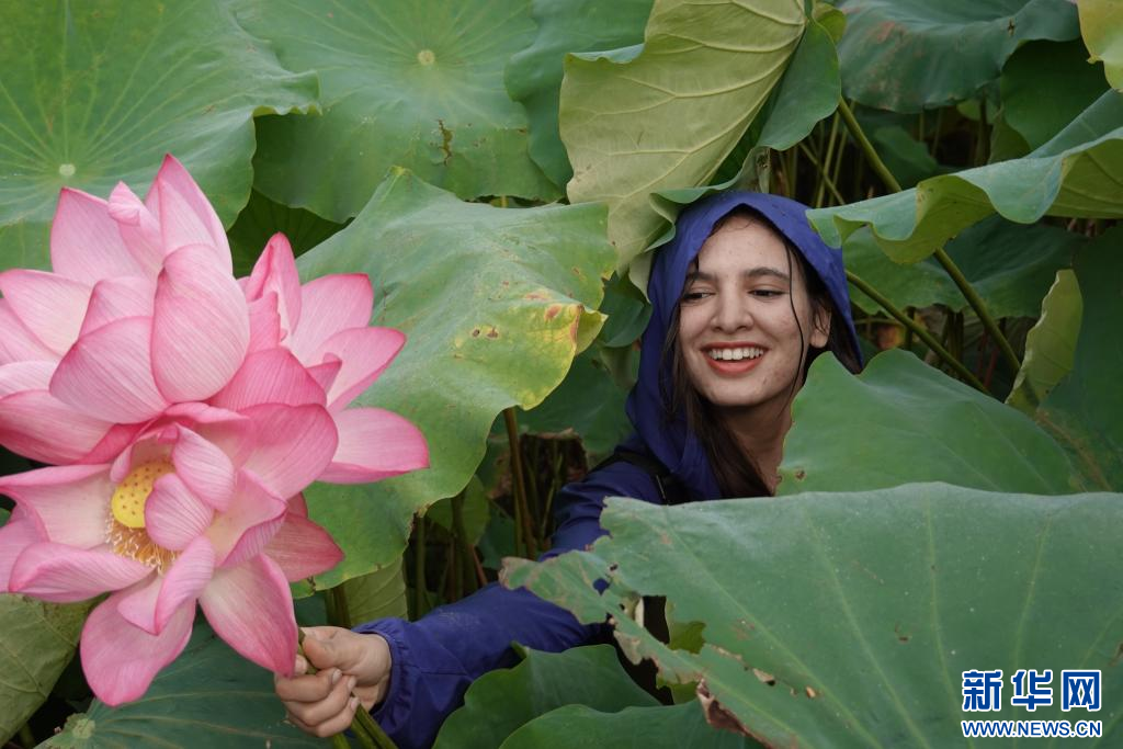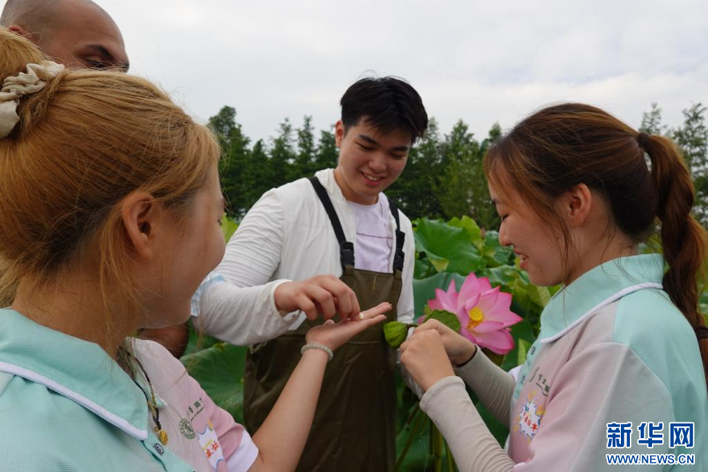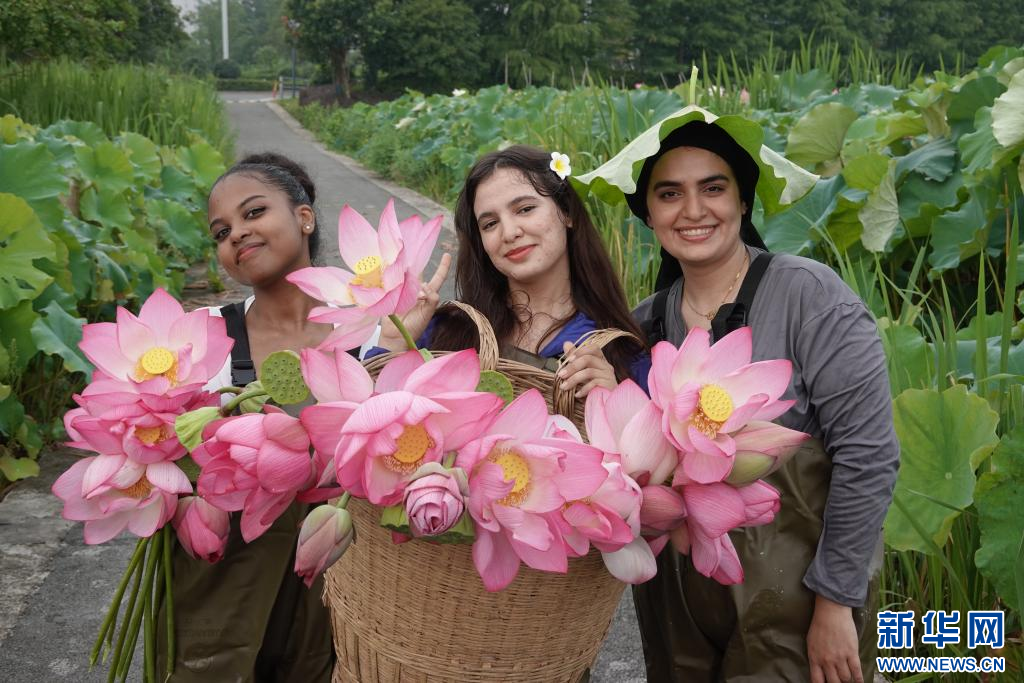 7月15日,在宁波市奉化区岳林街道斯张村,来自宁波大学商学院的留学生在荷塘边收获满满。新华网发张若昊 摄(宁波大学供图)
