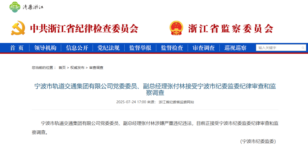 宁波市轨道交通集团有限公司党委委员、副总经理张付林涉嫌严重违纪违法,目前正接受宁波市纪委监委纪律审查和监察调查。