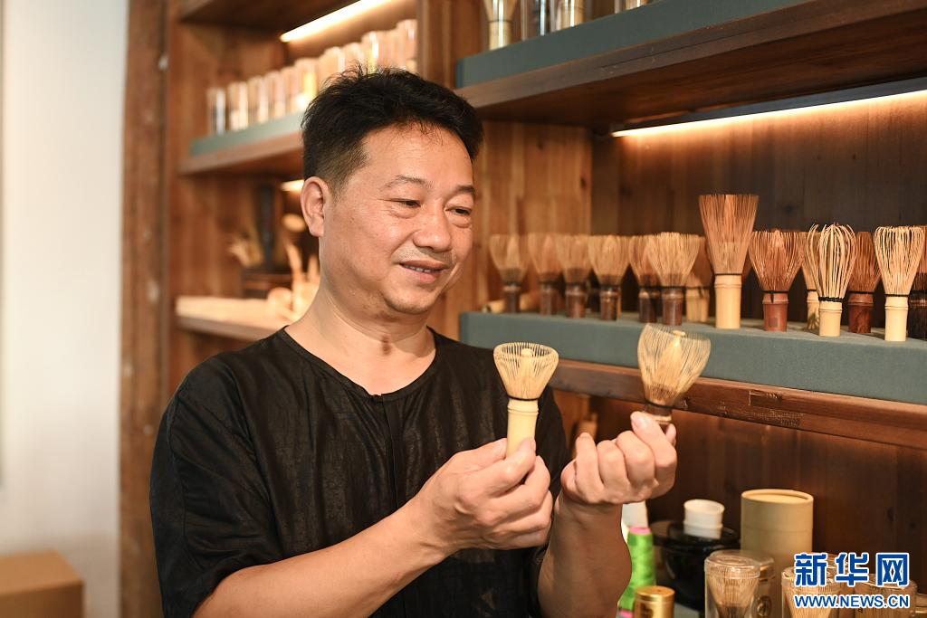 8月5日,在浙江省杭州市余杭区径山村,非遗传承人陈金信展示手工制作的茶筅。