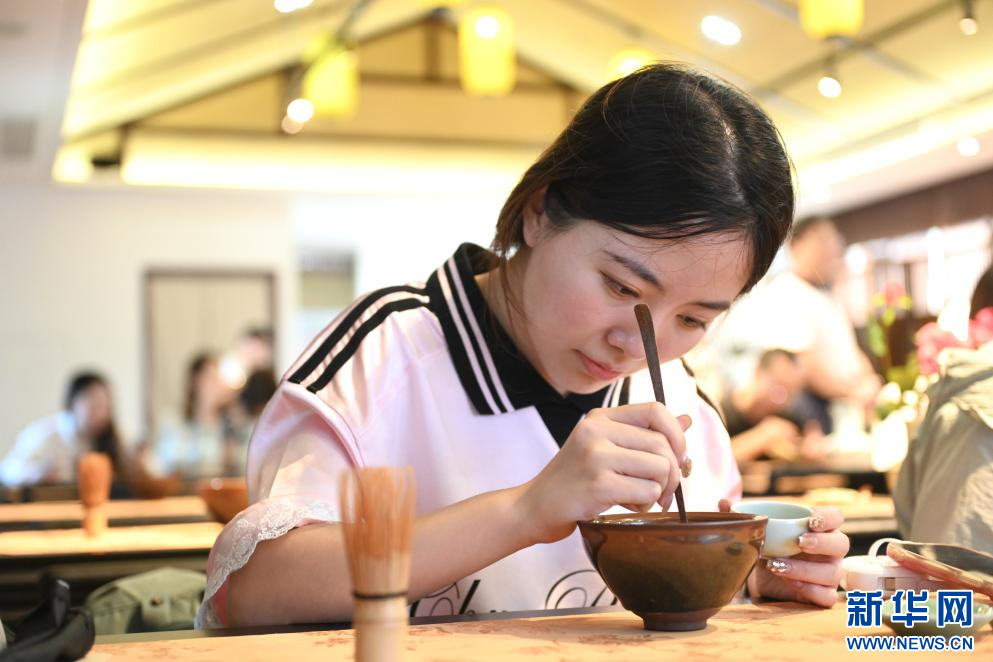 8月5日,在浙江省杭州市余杭区径山村,一名游客体验传统点茶。