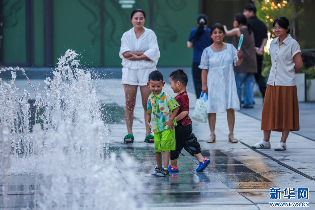 8月7日,嘉兴市南湖区南湖天地商业街区,小朋友在喷泉广场嬉戏。