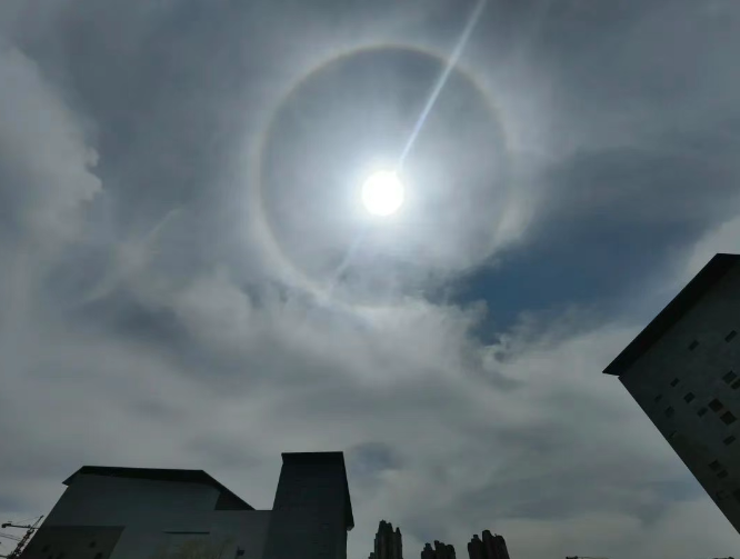 10日,杭州上空出现了日晕,它明晃晃地悬挂在上空,太阳周围就像环绕着巨大的光环,宛如戴上了一枚“发光美瞳”。