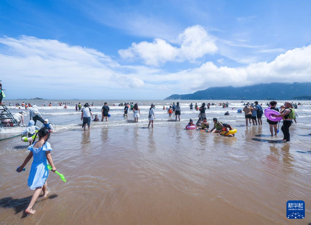 8月12日,游客在朱家尖南沙景区沙滩上游玩。