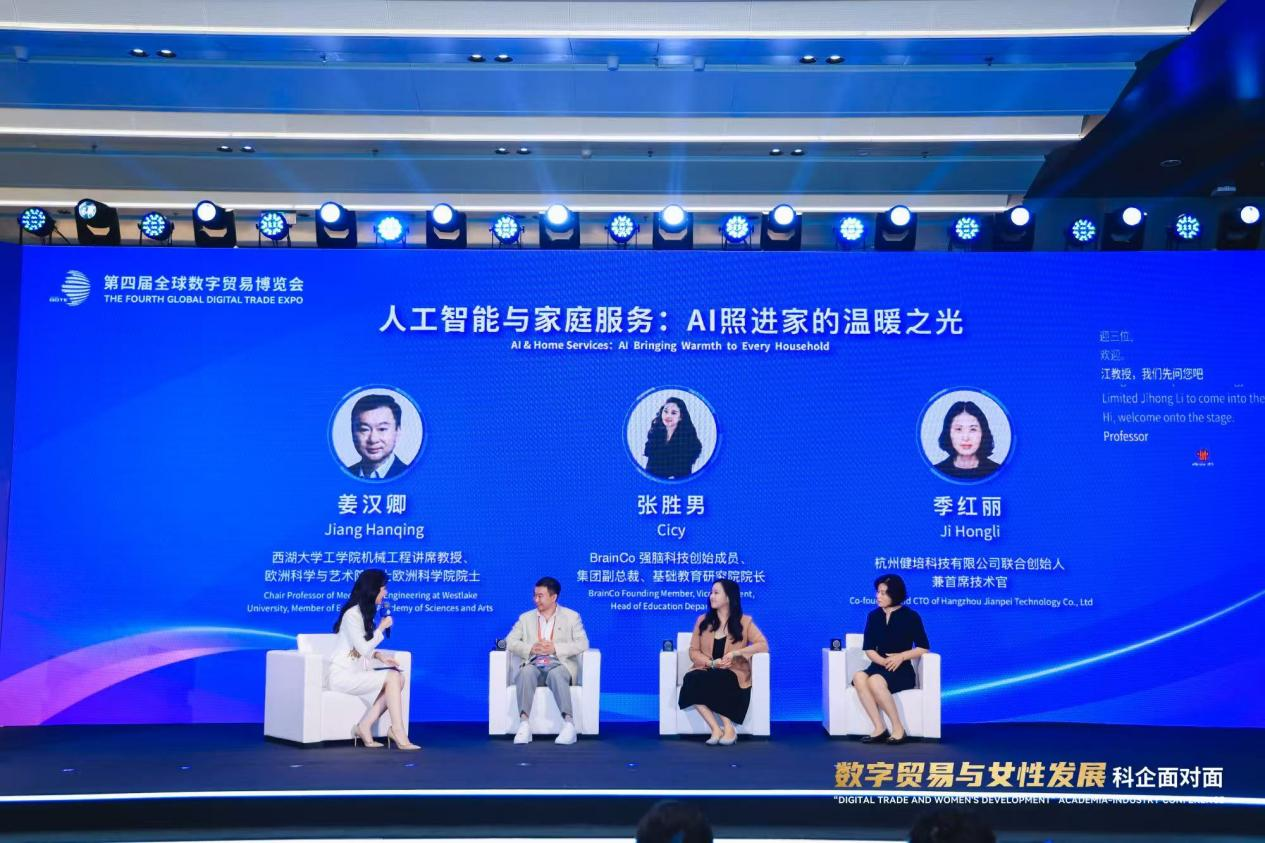 在人工智能与家庭服务主题对话中,西湖大学姜汉卿教授介绍了团队研发的“柔性机械臂”机器人,让机器人成为家庭中温暖、可靠的伙伴。BrainCo强脑科技创始成员张胜男分享了脑机接口+AI技术如何帮助孤独症儿童进行干预训练。健培科技联合创始人兼首席技术官季红丽介绍了AI健康监护系统,展现了AI在养老育幼中的科技温度。