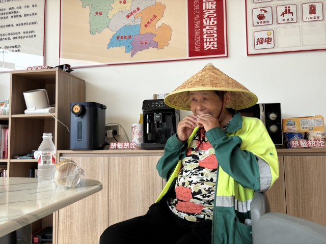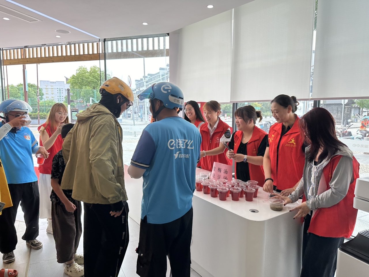 上午送单间隙,外卖骑手杨涛走进浙江省嘉善县西塘镇邮电东路的户外劳动者站点,接过志愿者递来的一杯凉茶,“咕嘟咕嘟”连喝了几大口,他终于能在忙碌中喘口气。