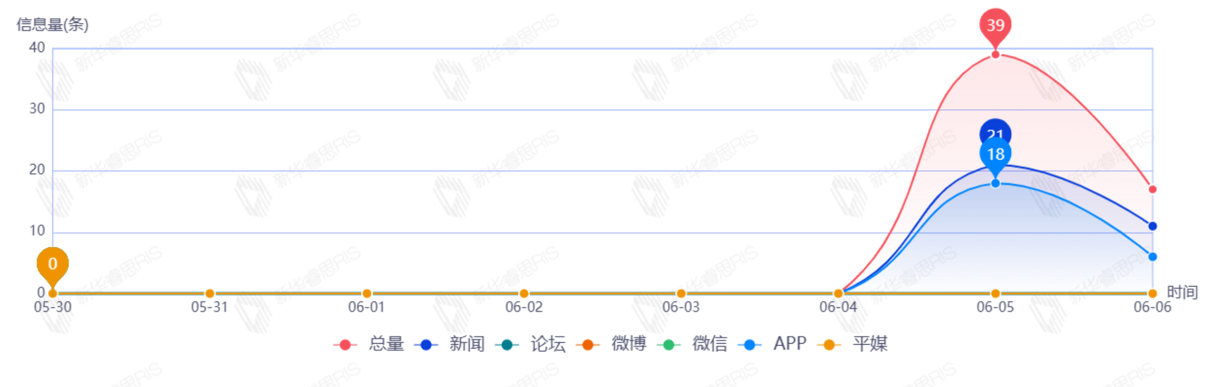 截至目前,该文章在互联网上传播总量为40篇,其中6月4日是信息发布的高峰期,发布信息量为26篇。各信源的信息发布情况中,APP信息占比最大,其次是新闻和微信,信息量分别为17篇、16篇、2篇,占比分别为48.57%、45.71%、5.71%。(数据来源:新华睿思系统)