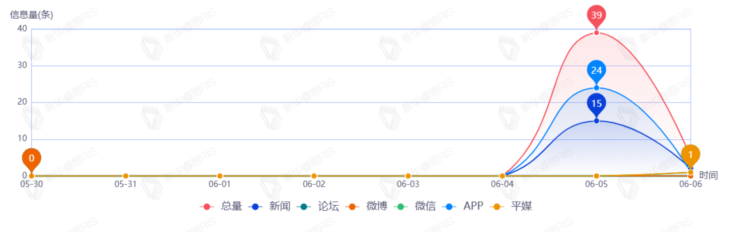 截至目前,该文章在互联网上传播总量为44篇,其中6月5日是信息发布的高峰期,发布信息量为39篇。各信源的信息发布情况中,APP信息占比最大,其次是新闻和平媒,信息量分别为18篇、17篇、1篇,占比分别为8.65%、45.95%、2.70%。(数据来源:新华睿思系统)