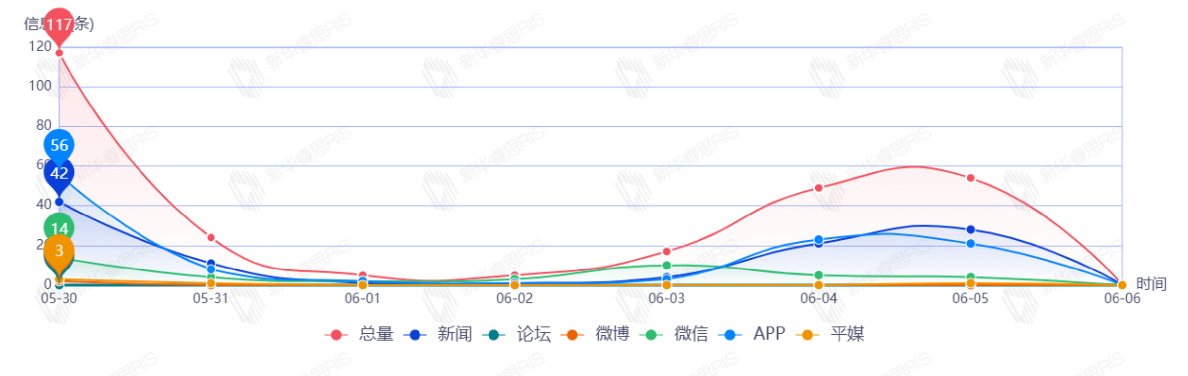 截至目前,该文章在互联网上传播总量为271篇,其中5月30日是信息发布的高峰期,发布信息量为117篇。各信源的信息发布情况中,新闻信息占比最大,其次是APP和微信,信息量分别为108篇、95篇、42篇,占比分别为42.86%、37.70%、16.67%。(数据来源:新华睿思系统)