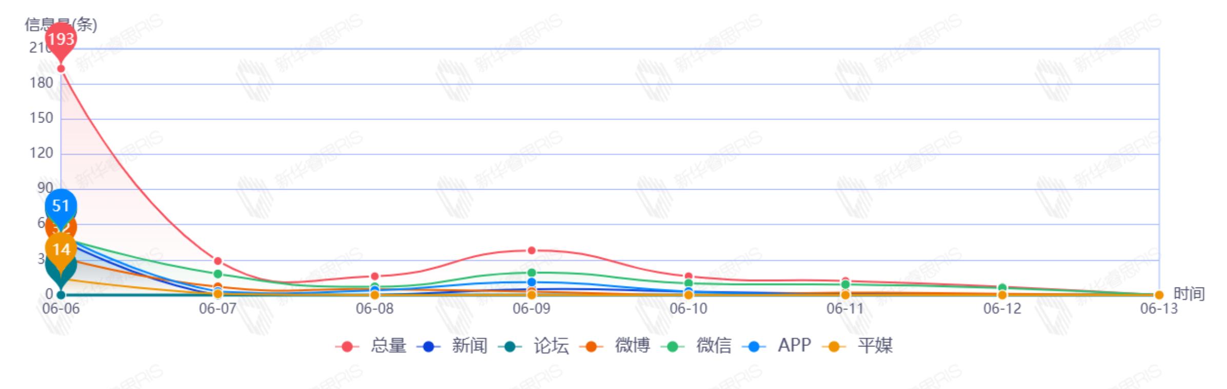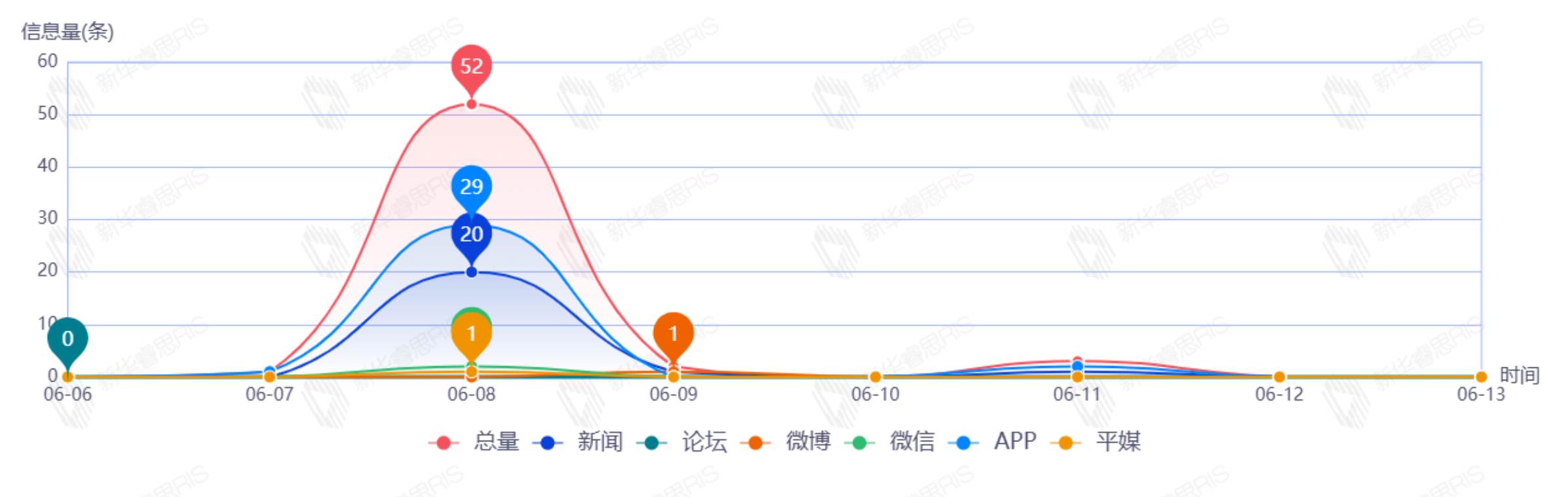 截至目前,该文章在互联网上传播总量为58篇,其中6月8日是信息发布的高峰期,发布信息量为52篇。各信源的信息发布情况中,APP信息占比最大,其次是新闻和微信,信息量分别为25篇、22篇、2篇,占比分别为49.02%、43.14%、3.92%。(数据来源:新华睿思系统)