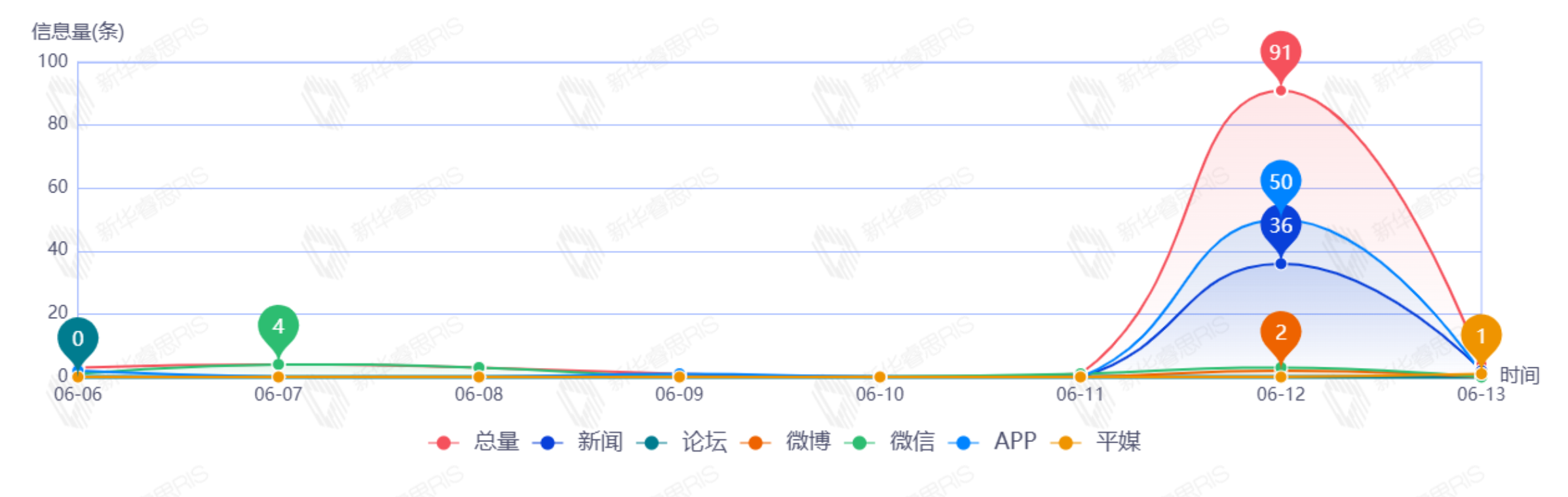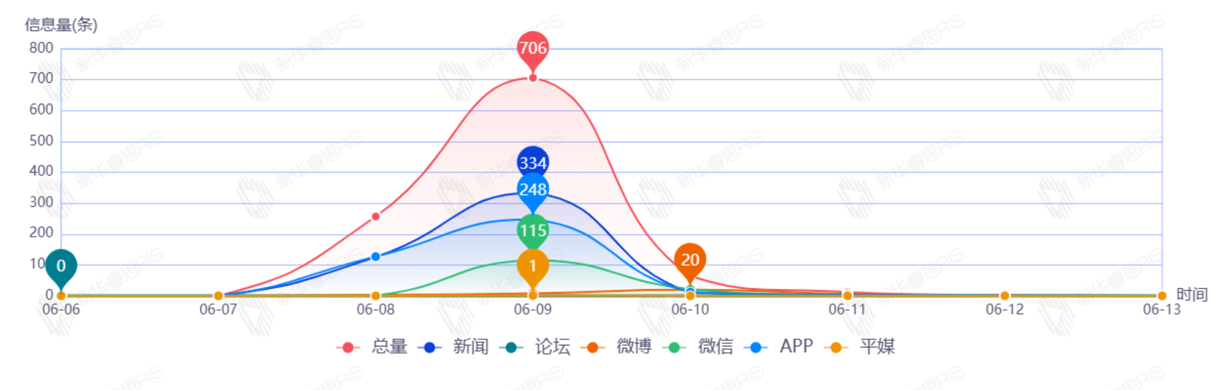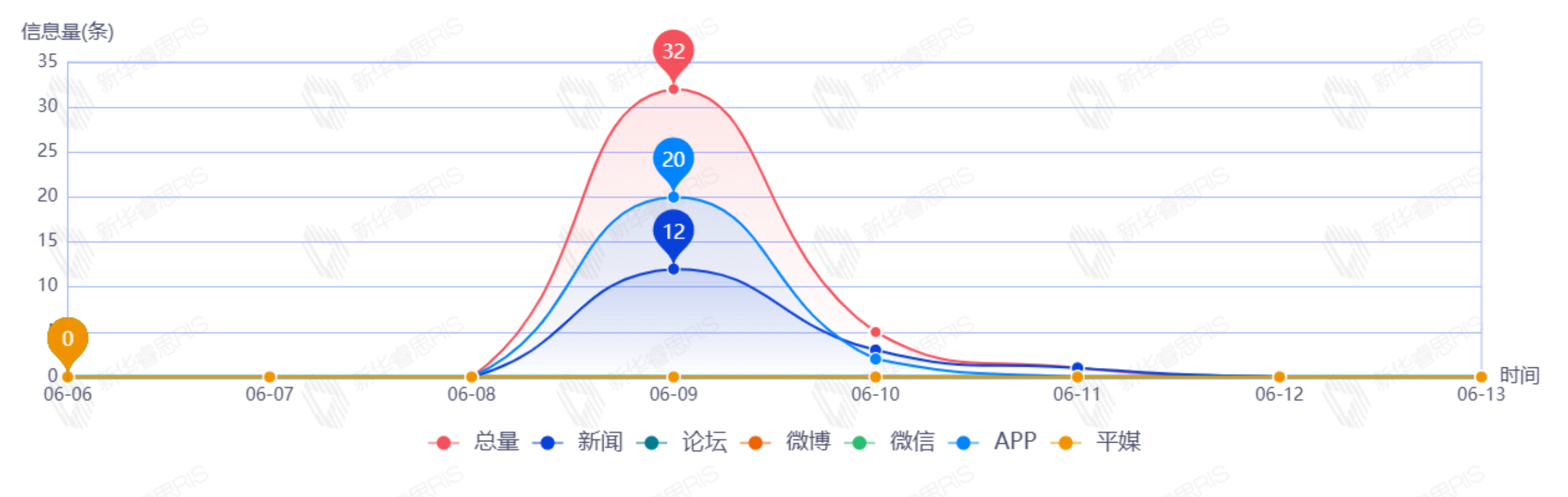 截至目前,该文章在互联网上传播总量为38篇,其中6月9日是信息发布的高峰期,发布信息量为32篇。各信源的信息发布情况中,新闻信息占比最大,其次是APP,信息量分别为16篇、16篇,占比分别为50.00%、50.00%。(数据来源:新华睿思系统)