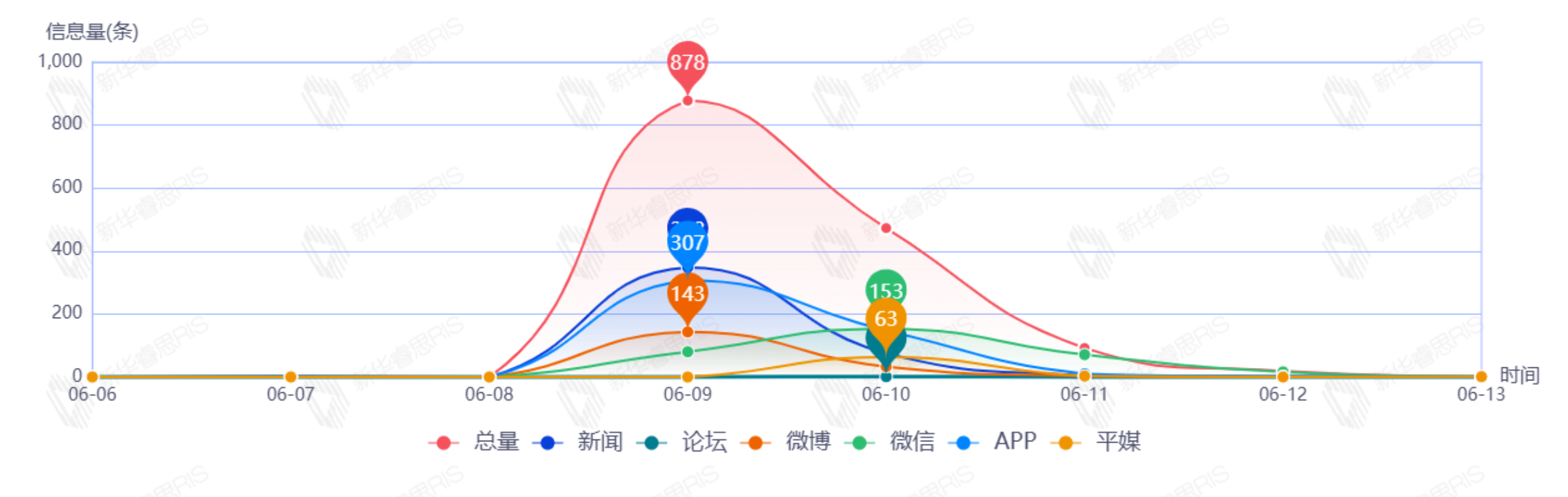 截至目前,该文章在互联网上传播总量为1465篇,其中6月9日是信息发布的高峰期,发布信息量为878篇。各信源的信息发布情况中,新闻信息占比最大,其次是APP和微信,信息量分别为429篇、365篇、320篇,占比分别为31.50%、26.80%、23.49%。(数据来源:新华睿思系统)