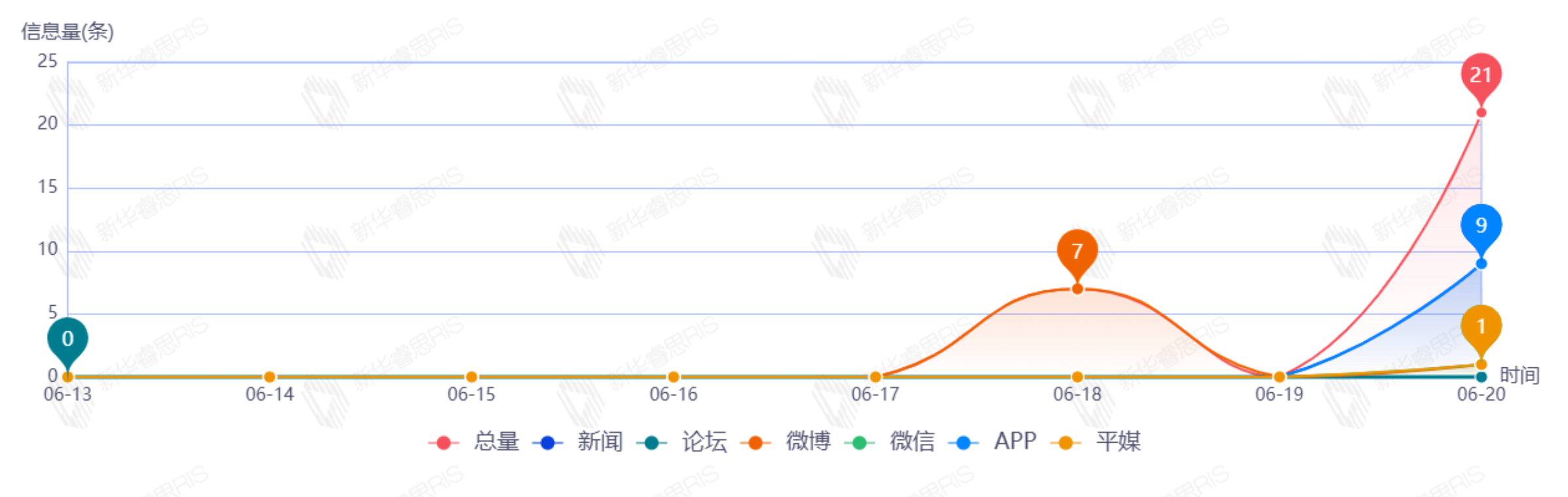 截至目前,该文章在互联网上传播总量为28篇,其中6月20日是信息发布的高峰期,发布信息量为21篇。各信源的信息发布情况中,新闻信息占比最大,其次是微博和APP,信息量分别为9篇、8篇、7篇,占比分别为34.62%、30.77%、26.92%。(数据来源:新华睿思系统)
