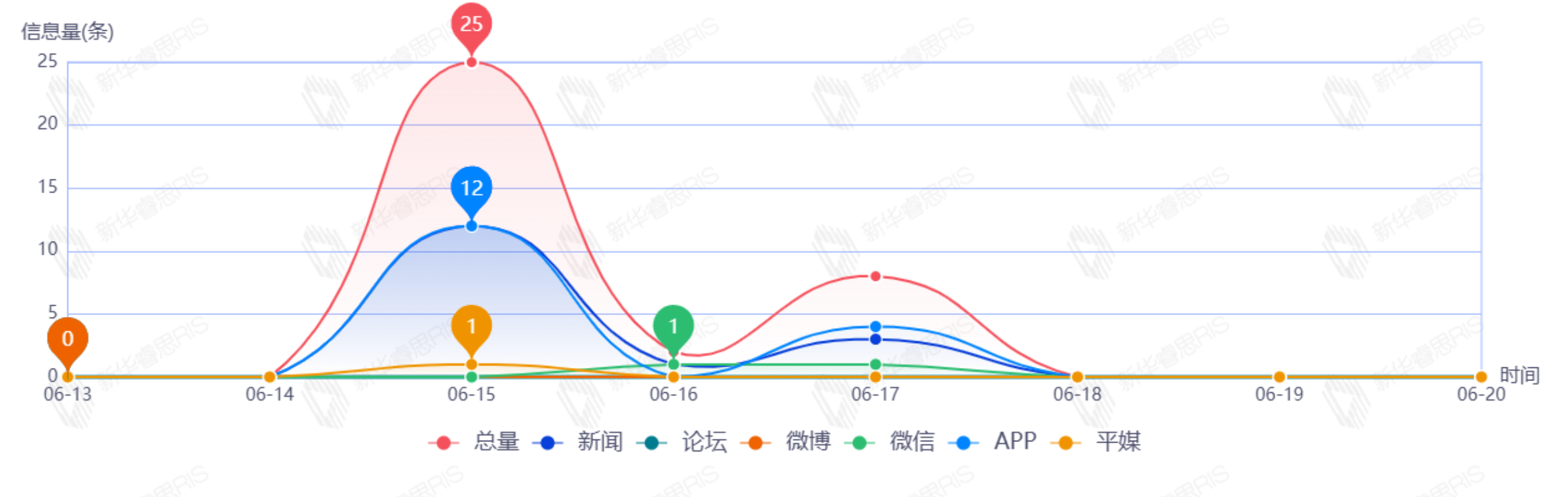 截至目前,该文章在互联网上传播总量为35篇,其中6月15日是信息发布的高峰期,发布信息量为25篇。各信源的信息发布情况中,新闻信息占比最大,其次是APP和微信,信息量分别为16篇、16篇、2篇,占比分别为45.71%、45.71%、5.71%。(数据来源:新华睿思系统)