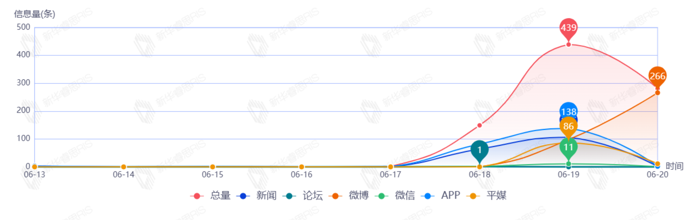截至目前,该文章在互联网上传播总量为871篇,其中6月19日是信息发布的高峰期,发布信息量为439篇。各信源的信息发布情况中,微博信息占比最大,其次是APP和新闻,信息量分别为362篇、174篇、167篇,占比分别为44.31%、21.30%、20.44%。(数据来源:新华睿思系统)