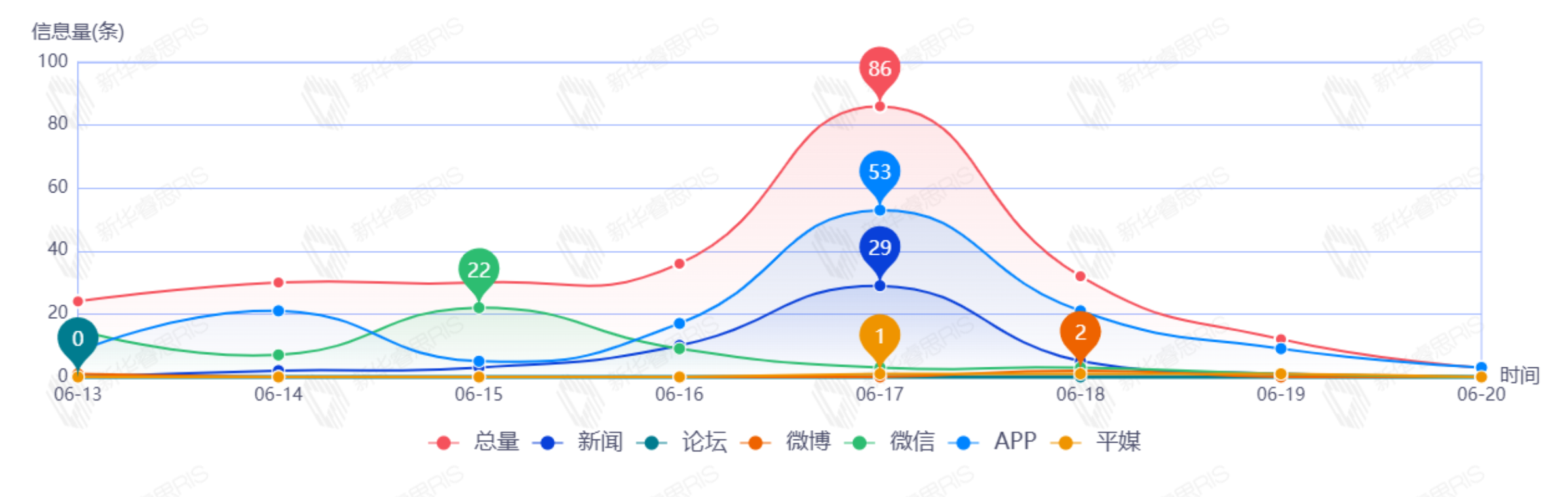 截至目前,该文章在互联网上传播总量为253篇,其中6月17日是信息发布的高峰期,发布信息量为86篇。各信源的信息发布情况中,APP信息占比最大,其次是微信和新闻,信息量分别为110篇、60篇、50篇,占比分别为48.67%、26.55%、22.12%。(数据来源:新华睿思系统)