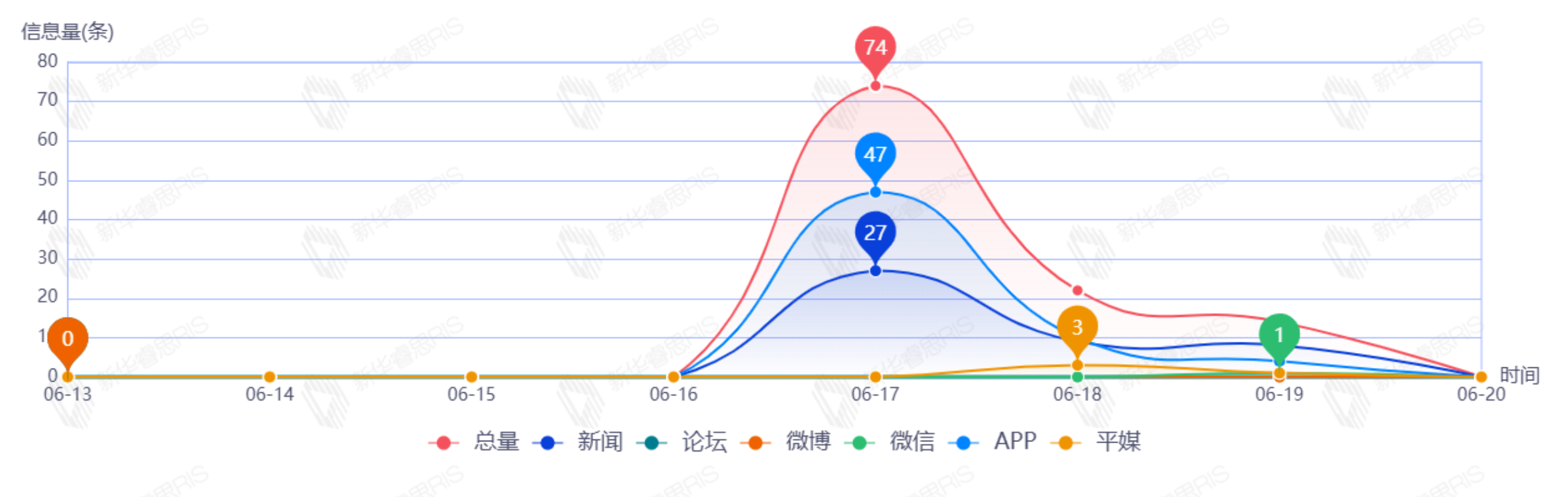 截至目前,该文章在互联网上传播总量为110篇,其中6月17日是信息发布的高峰期,发布信息量为74篇。各信源的信息发布情况中,APP信息占比最大,其次是新闻和平媒,信息量分别为47篇、43篇、4篇,占比分别为49.47%、45.26%、4.21%。(数据来源:新华睿思系统)