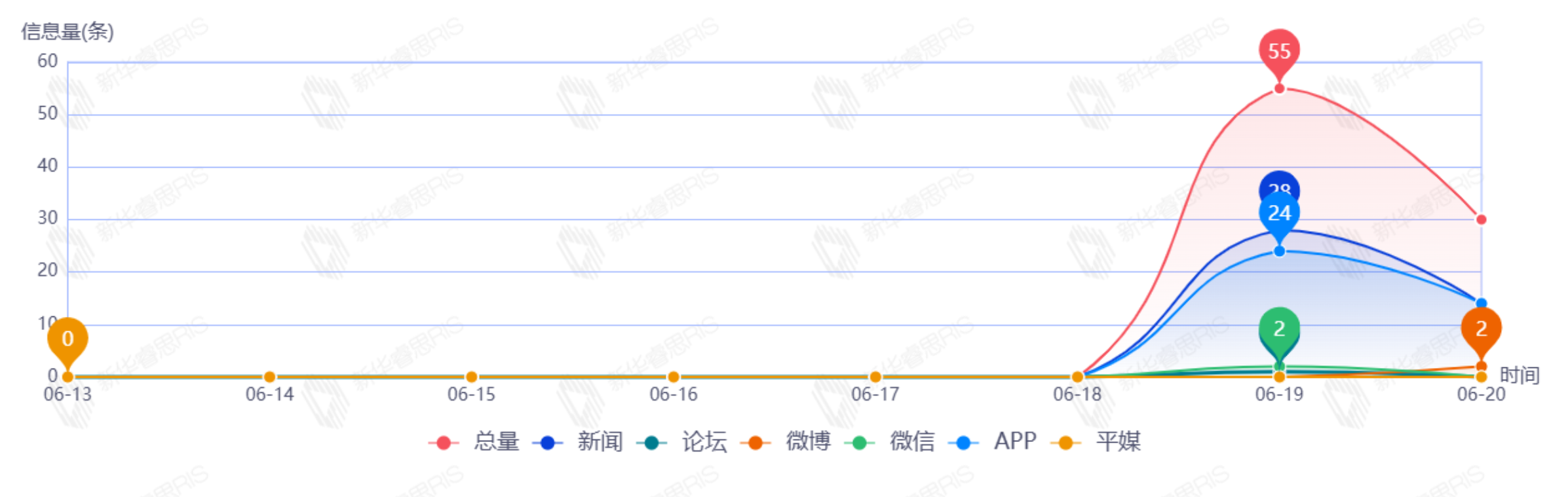 截至目前,该文章在互联网上传播总量为85篇,其中6月19日是信息发布的高峰期,发布信息量为55篇。各信源的信息发布情况中,新闻信息占比最大,其次是APP和微信,信息量分别为42篇、32篇、2篇,占比分别为53.16%、40.51%、2.53%。(数据来源:新华睿思系统)