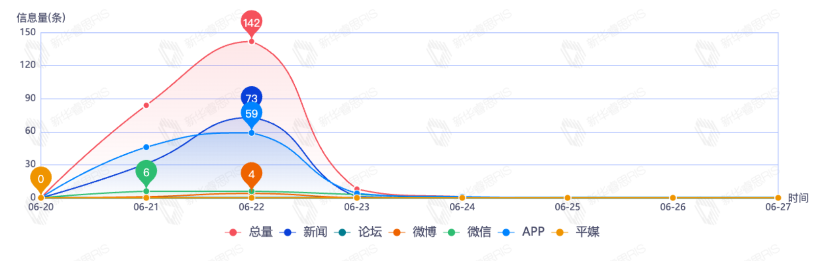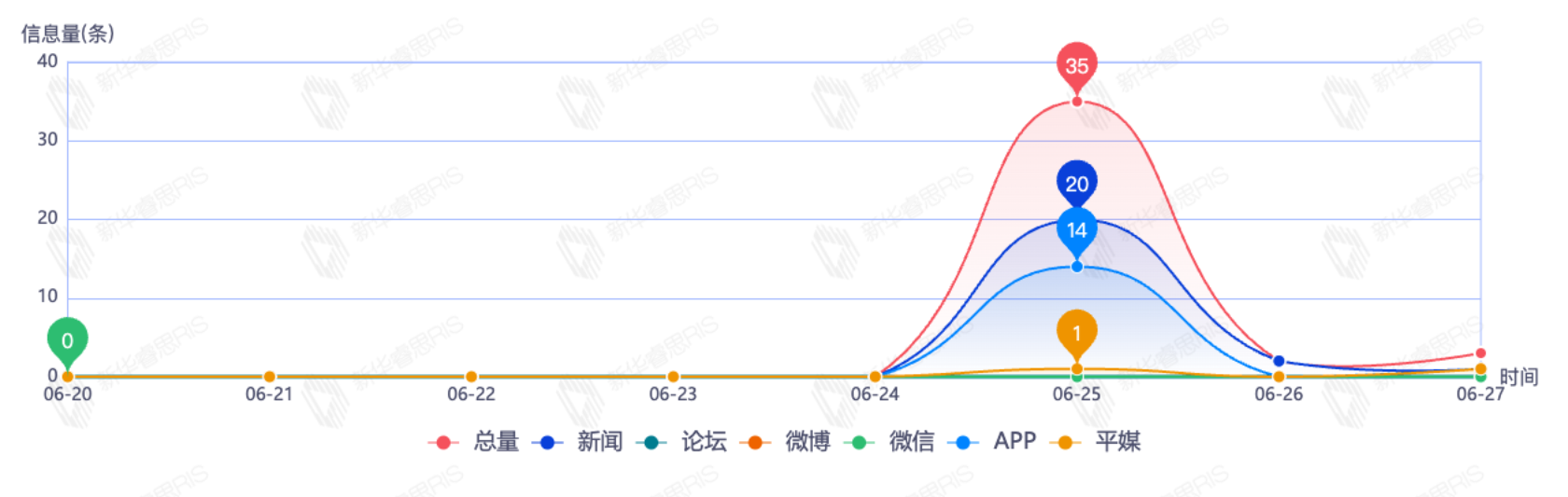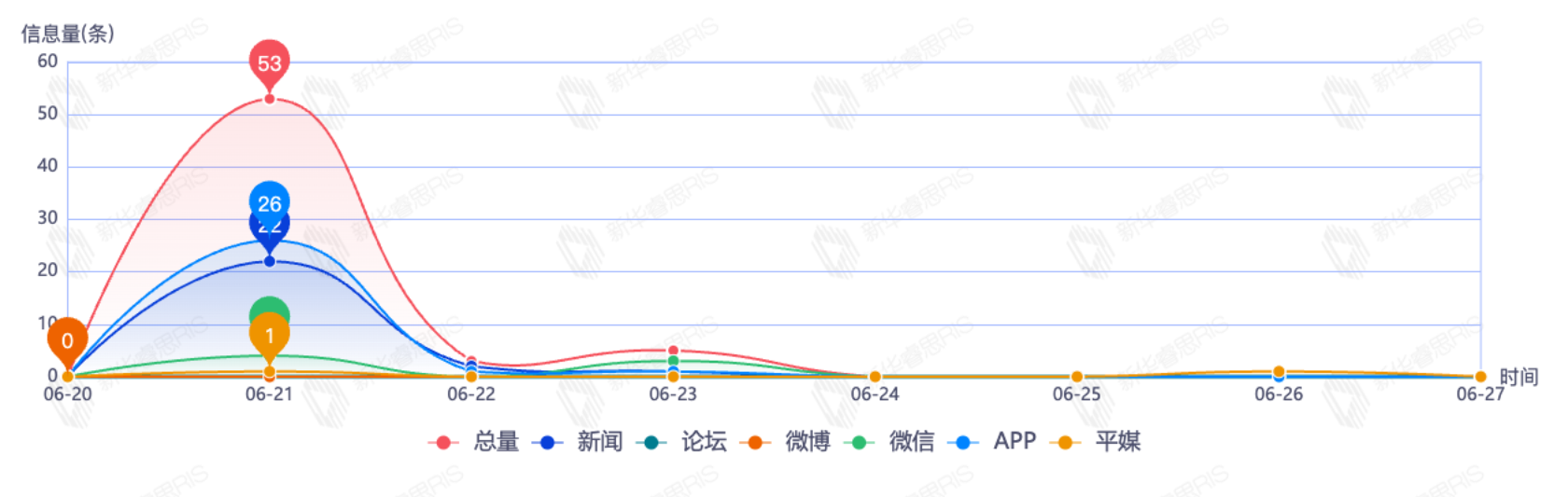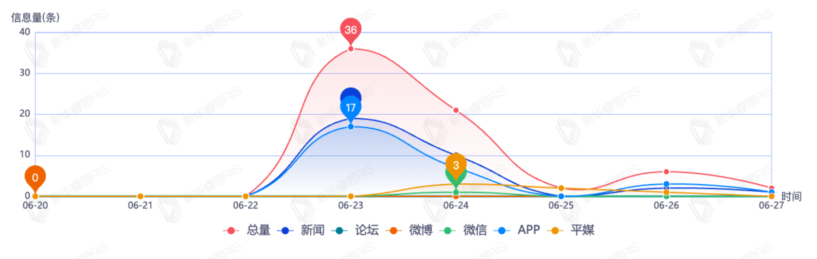 截至目前,该文章在互联网上传播总量为67篇,其中6月23日是信息发布的高峰期,发布信息量为36篇。各信源的信息发布情况中,新闻信息占比最大,其次是APP和平媒,信息量分别为32篇、21篇、6篇,占比分别为53.33%、35.00%、10.00%。(数据来源:新华睿思系统)