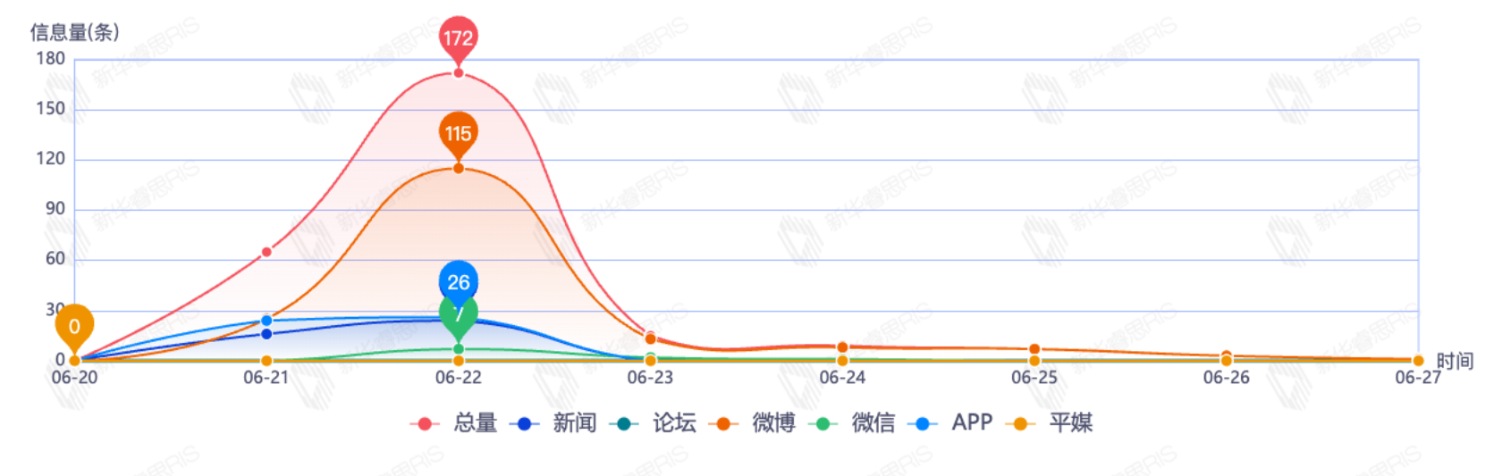 截至目前,该文章在互联网上传播总量为272篇,其中6月22日是信息发布的高峰期,发布信息量为172篇。各信源的信息发布情况中,微博信息占比最大,其次是APP和新闻,信息量分别为159篇、48篇、40篇,占比分别为61.87%、18.68%、15.56%。(数据来源:新华睿思系统)
