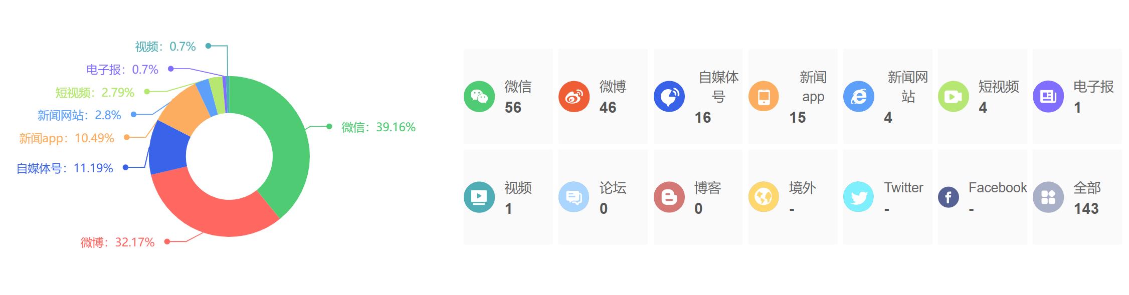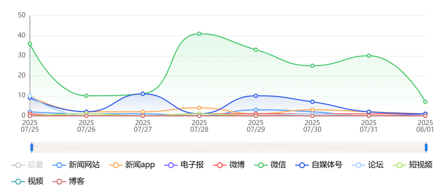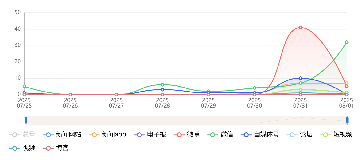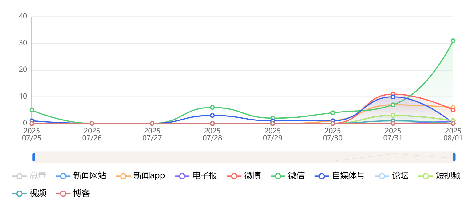 截至目前,该文章在互联网上传播总量为143篇,其中7月31日是信息发布的高峰期。各信源的信息发布情况中,微信信息占比最大,其次是微博和自媒体号,信息量分别为56篇、46篇、16篇,占比分别为39.16%、32.17%、11.19%。(数据来源:新华睿思系统)