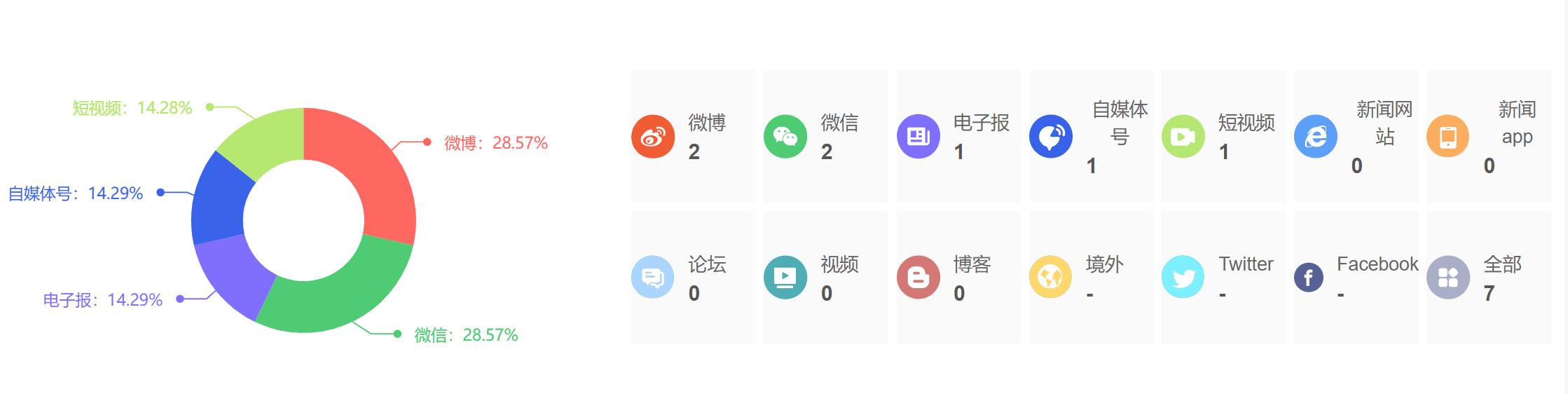 截至目前,该文章在互联网上传播总量为7篇,其中7月30日是信息发布的高峰期。各信源的信息发布情况中,微博信息占比最大,其次是微信和电子报,信息量分别为2篇、2篇、1篇,占比分别为28.57%、28.57%、14.29%。(数据来源:新华睿思系统)