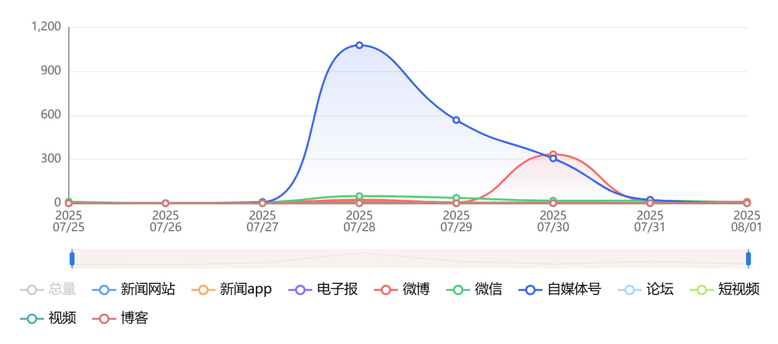 截至目前,该文章在互联网上传播总量为2612篇,其中7月28日是信息发布的高峰期。各信源的信息发布情况中,自媒体号信息占比最大,其次是微博和微信,信息量分别为1985篇、390篇、143篇,占比分别为76%、14.93%、5.48%。(数据来源:新华睿思系统)