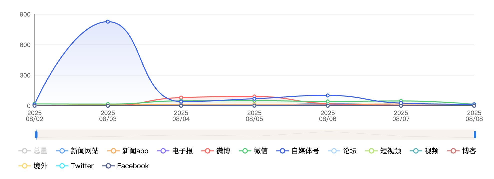 截至目前,该文章在互联网上传播总量为5161篇,其中8月7日是信息发布的高峰期。各信源的信息发布情况中,自媒体号信息占比最大,其次是微信和新闻app,信息量分别为4013篇、617篇、162篇,占比分别为77.75%、11.95%、3.14%。(数据来源:新华睿思系统)
