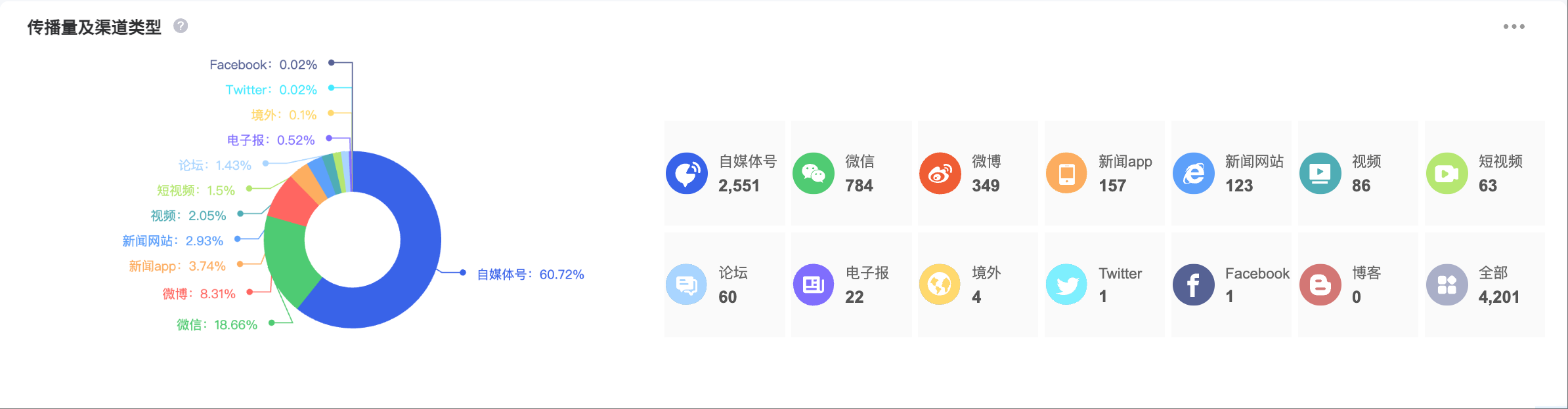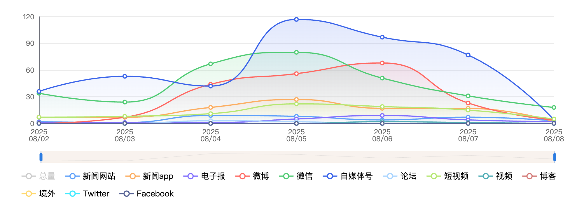 截至目前,该文章在互联网上传播总量为4201篇,其中8月7日是信息发布的高峰期。各信源的信息发布情况中,自媒体号信息占比最大,其次是微信和微博,信息量分别为2551篇、784篇、349篇,占比分别为60.72%、18.66%、8.31%。(数据来源:新华睿思系统)