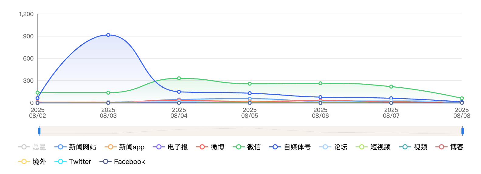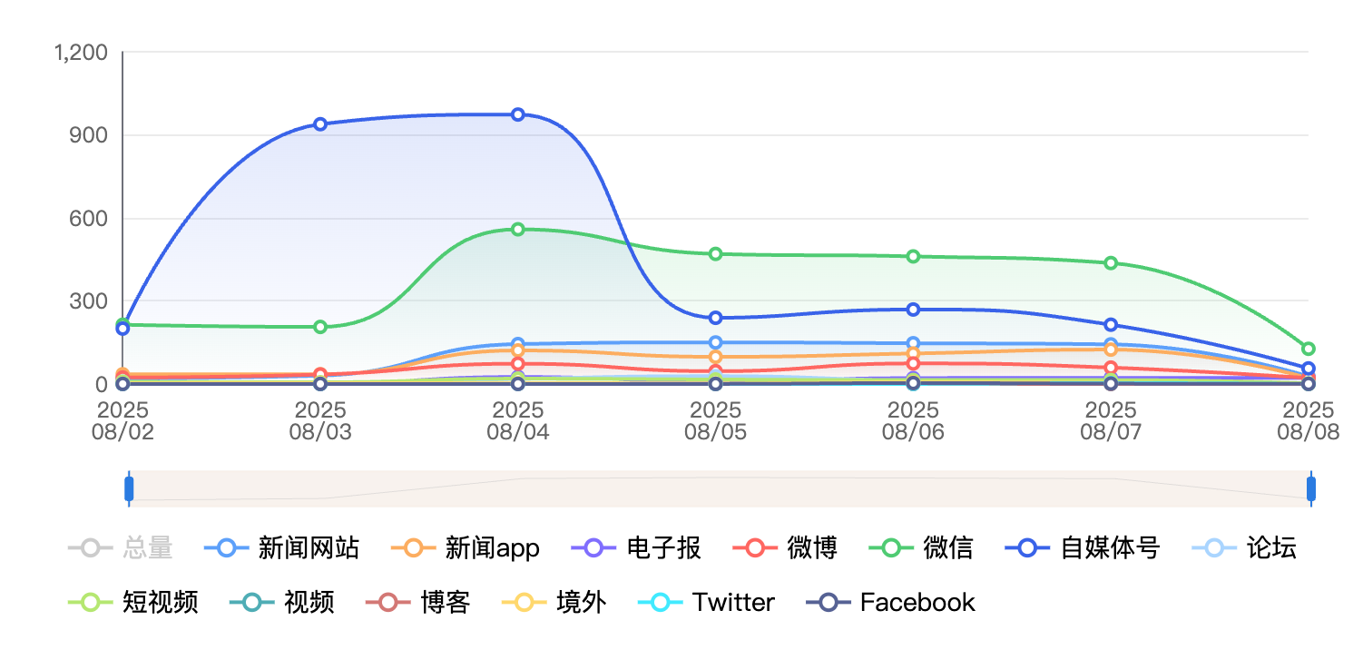 截至目前,该文章在互联网上传播总量为1189篇,其中8月5日是信息发布的高峰期。各信源的信息发布情况中,自媒体号信息占比最大,其次是微信和微博,信息量分别为425篇、305篇、202篇,占比分别为36.1%、25.85%、17.12%。(数据来源:新华睿思系统)